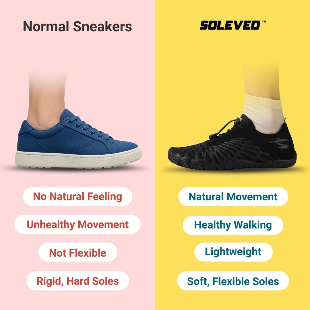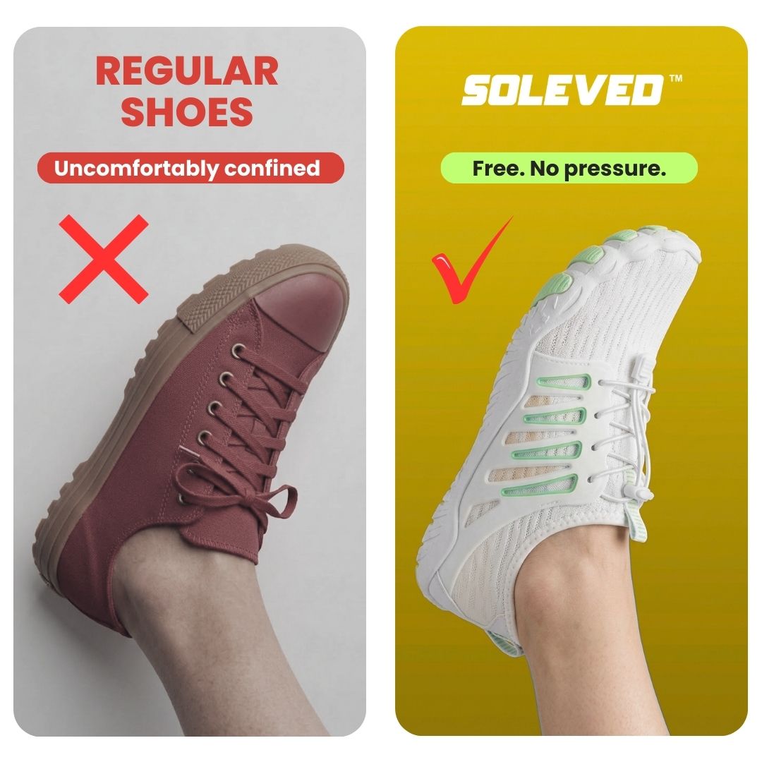 Soleved™ barefoot shoes are designed to allow your feet to move more naturally, with a flexible sole and a wider toe box that lets your toes spread comfortably. By reducing restriction and supporting natural movement, Soleved™ helps relieve pressure on your feet and provides a lighter, more comfortable walking experience throughout the day.